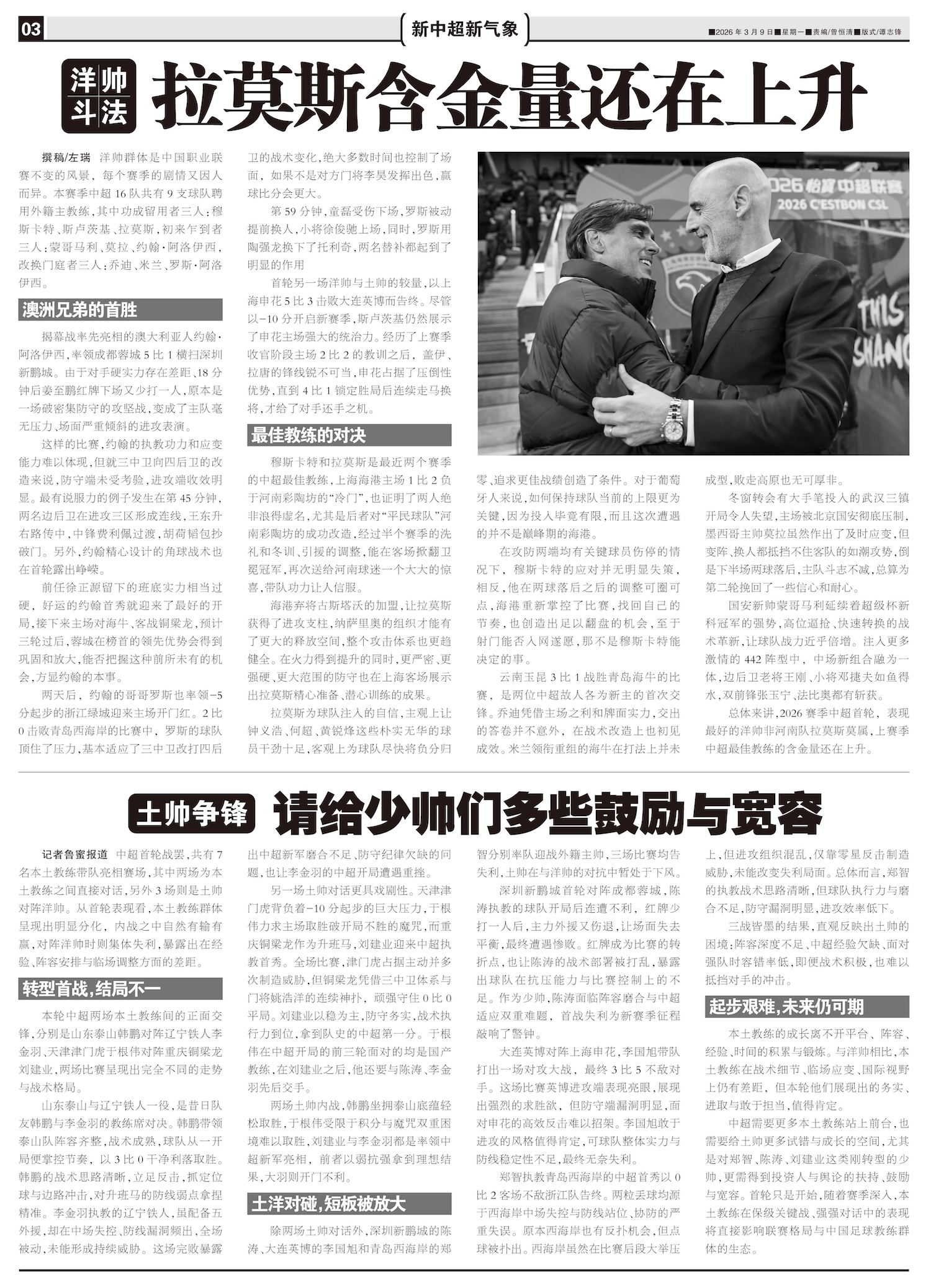 中超首轮战罢,共有7名本土教练带队亮相赛场,其中两场为本土教练之间直接对话,另外3场则是土帅对阵洋帅...