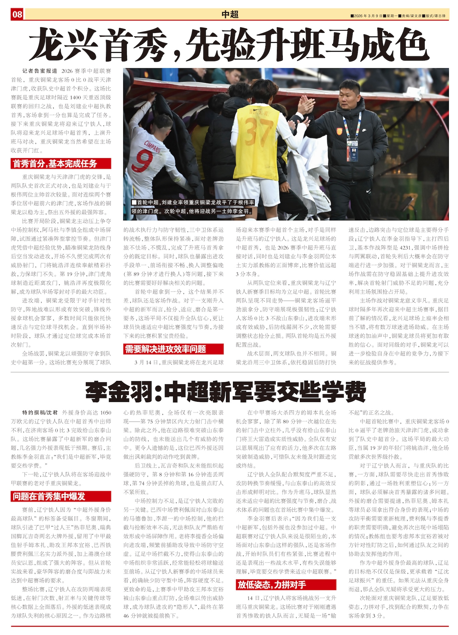 2026赛季中超联赛首轮,重庆铜梁龙客场0比0战平天津津门虎,收获队史中超首个积分。这场比赛既是重庆...