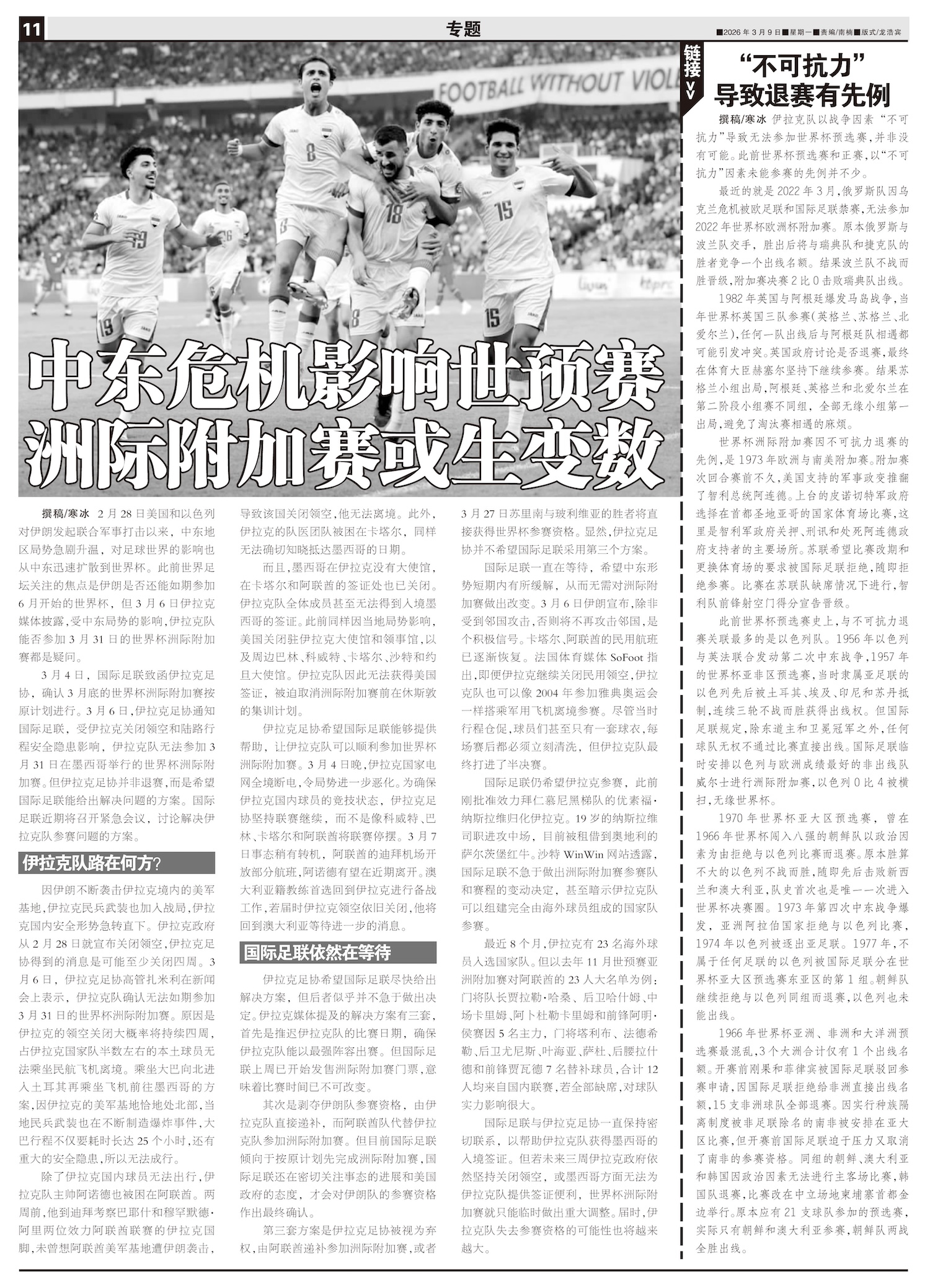 伊拉克队以战争因素“不可抗力”导致无法参加世界杯预选赛,并非没有可能。此前世界杯预选赛和正赛,以“不...
