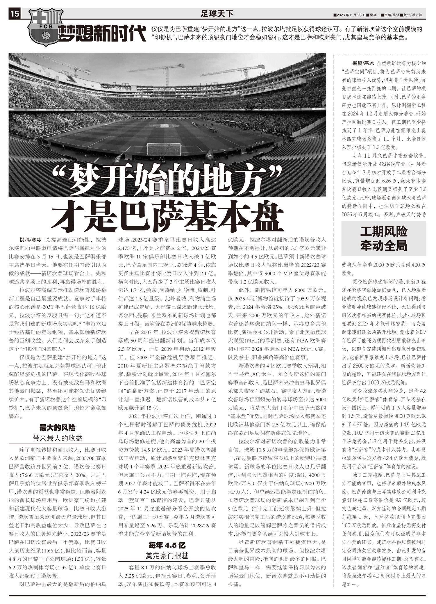 虽然新诺坎普为核心的“巴萨空间”项目,将为巴萨带来前所未有的球场收入优势,但并非全无风险。首先自然是...