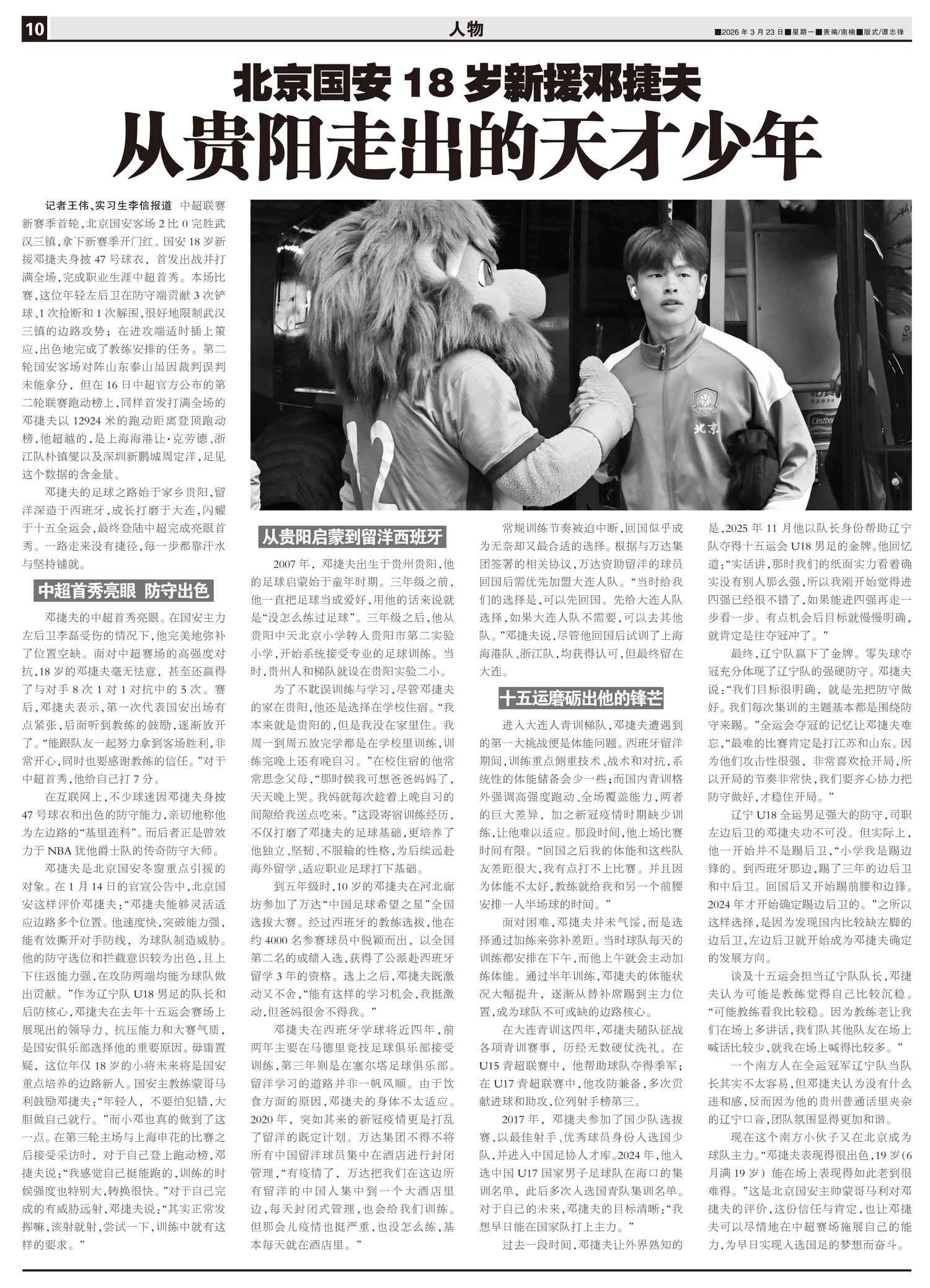 中超联赛新赛季首轮,北京国安客场2比0完胜武汉三镇,拿下新赛季开门红。国安18岁新援邓捷夫身披47号...