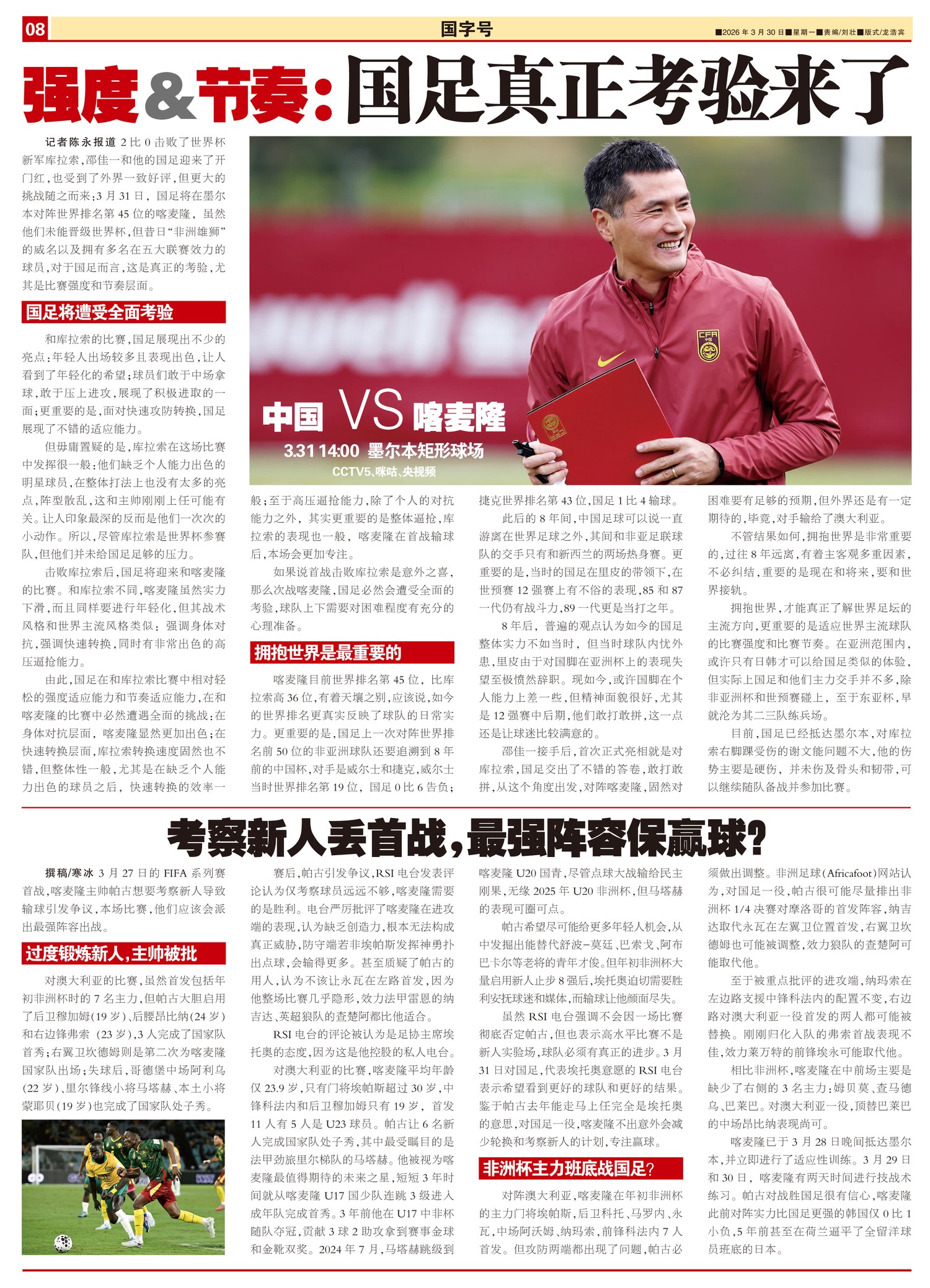 3月27日的FIFA系列赛首战,喀麦隆主帅帕古想要考察新人导致输球引发争议,本场比赛,他们应该会派出...