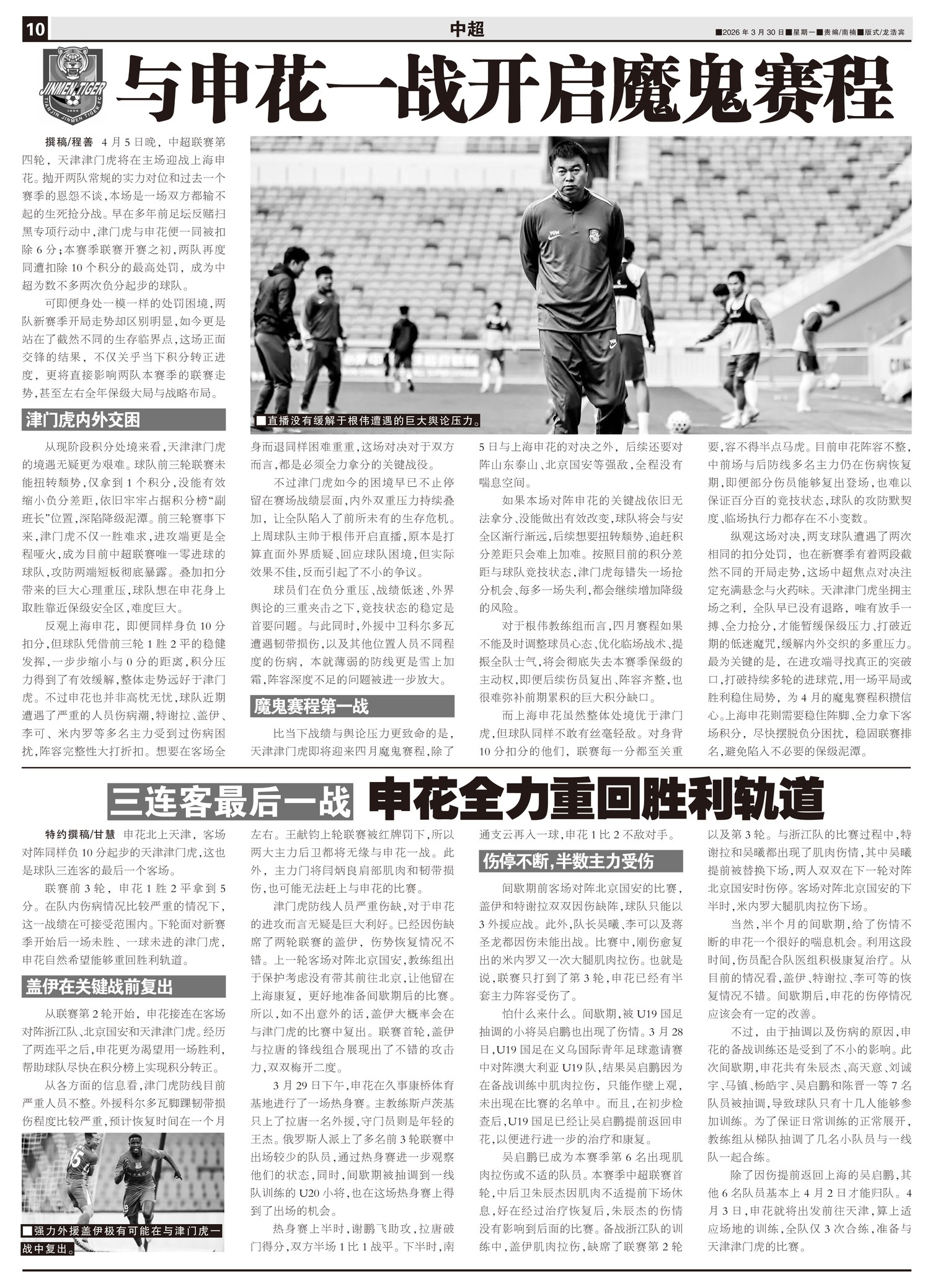4月5日晚,中超联赛第四轮,天津津门虎将在主场迎战上海申花。抛开两队常规的实力对位和过去一个赛季的恩...