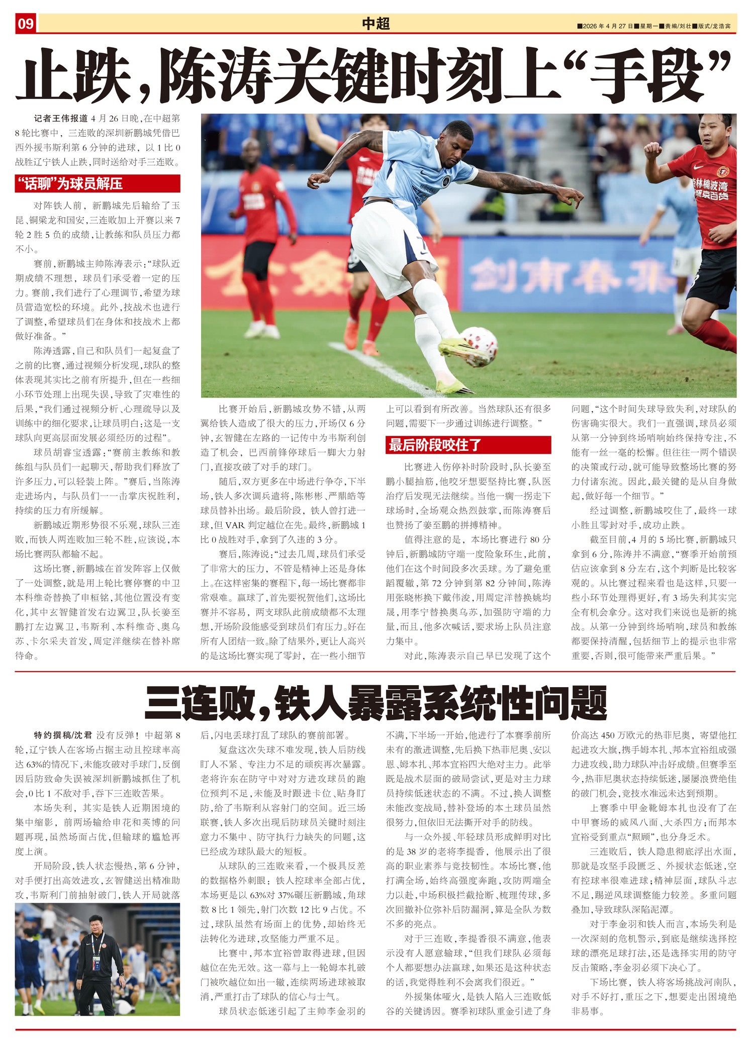 没有反弹!中超第8轮,辽宁铁人在客场占据主动且控球率高达63%的情况下,未能攻破对手球门,反倒因后防...