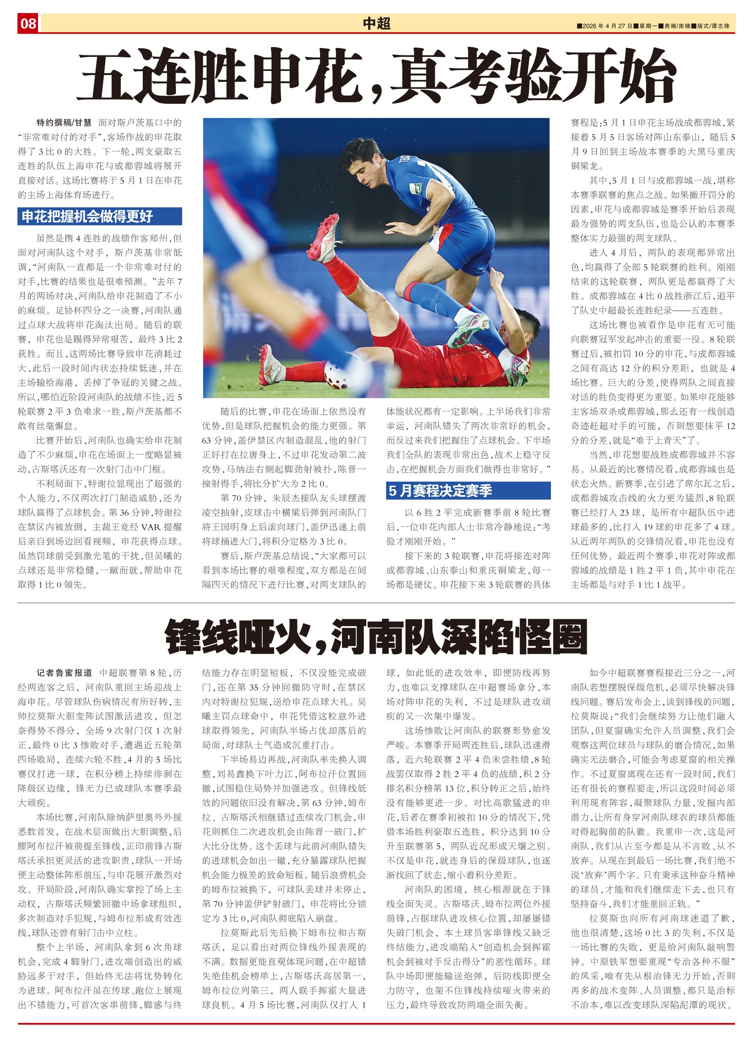 中超联赛第8轮,历经两连客之后,河南队重回主场迎战上海申花。尽管球队伤病情况有所好转,主帅拉莫斯大胆...