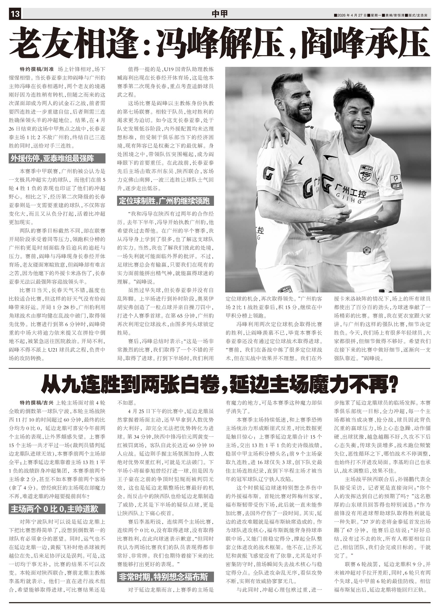 场上针锋相对,场下惺惺相惜。当长春亚泰主帅阎峰与广州豹主帅冯峰在长春相遇时,两个老友的境遇刚好因为连...