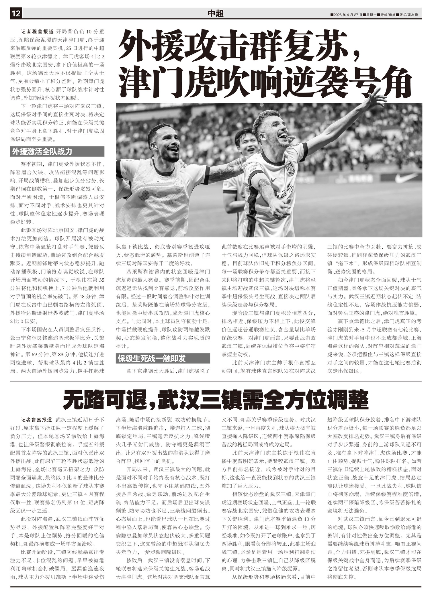 开局背负负10分重压、深陷保级泥潭的天津津门虎,终于迎来触底反弹的重要契机。25日进行的中超联赛第8...