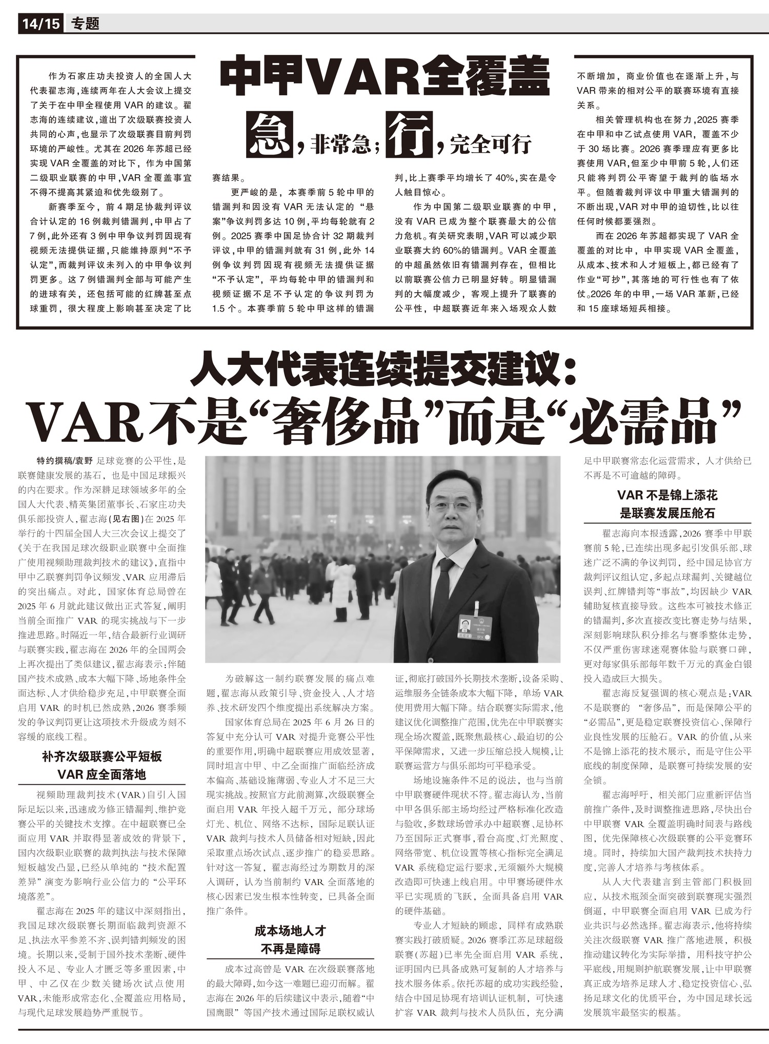 人大代表连续提交建议:VAR不是“奢侈品”而是“必需品”