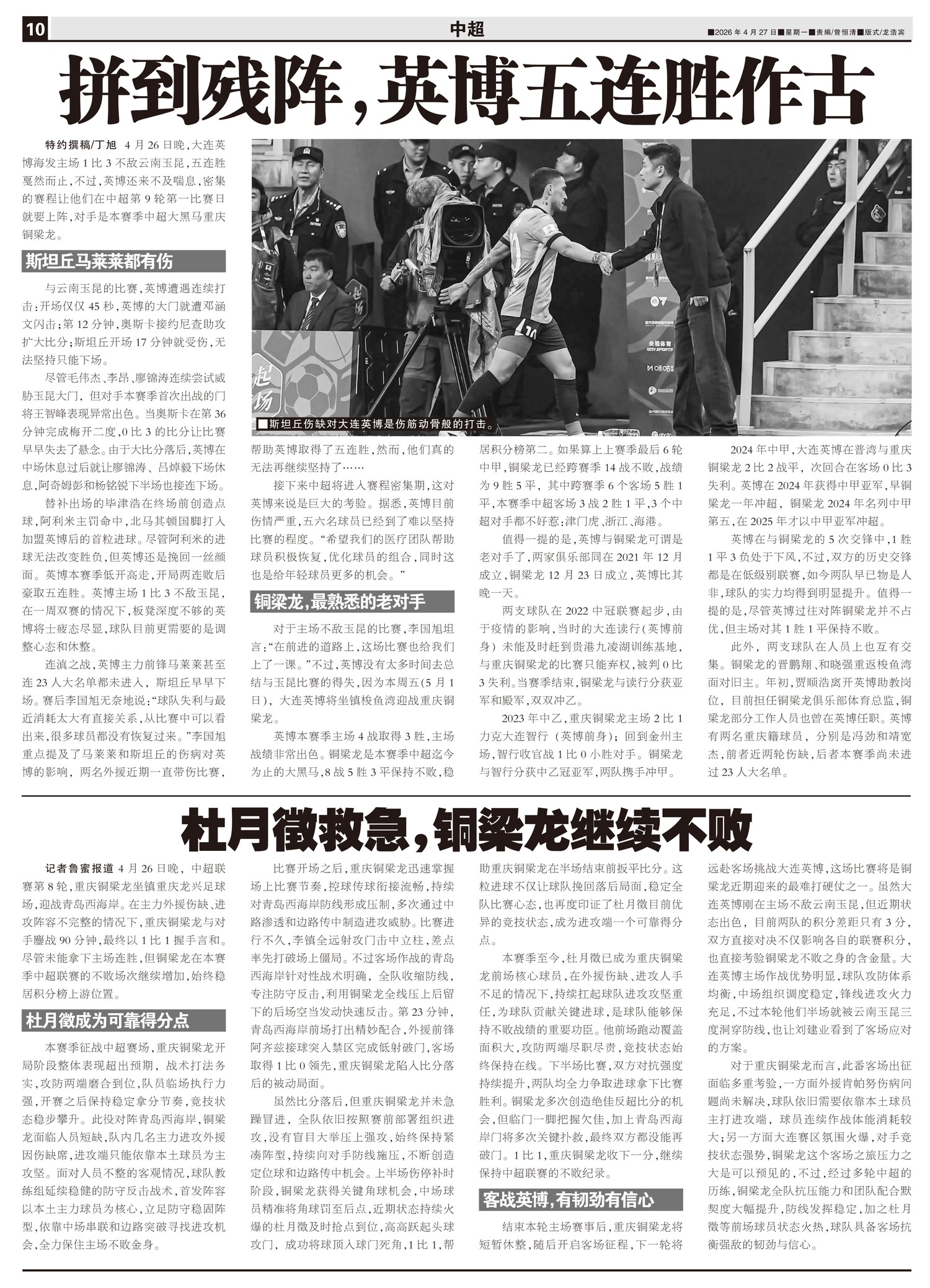 4月26日晚,中超联赛第8轮,重庆铜梁龙坐镇重庆龙兴足球场,迎战青岛西海岸。在主力外援伤缺、进攻阵容...